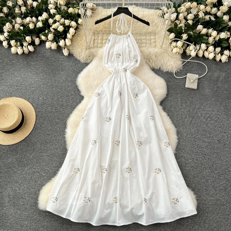 Moda Feminina Sexy Vestido De Praia Boêmia Branco De Verão Novo Bordado De Colarinho Oco Sem Costas Vestidos