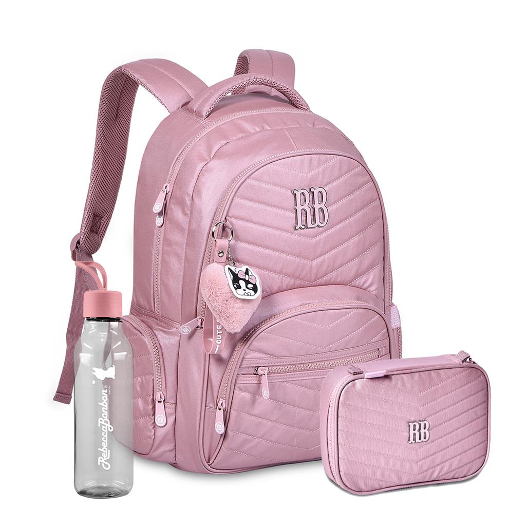 Kit Mochila Costas Estojo Box Metalizada Brilho Squeeze Oficial Rb Lancamento Adolescente Escolar Universitaria Pompom