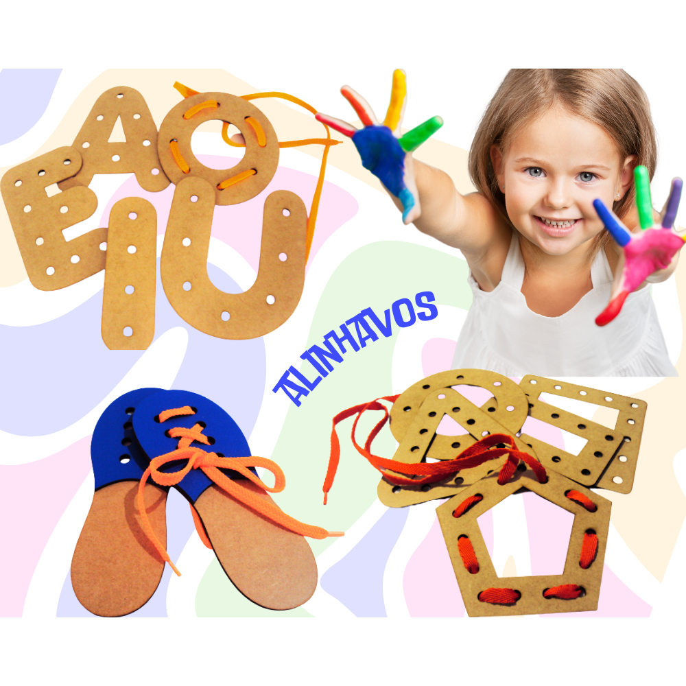 Brinquedos Educativos Alinhavos de Vogais, Formas Geométrica, Sapato em Mdf 3mm, Cognitivo madeira mdf, jogo tabuleiro pedagógico didático, alfabeto, Montessori, autista atividade educativa sensorial, Coordenação motora fina.