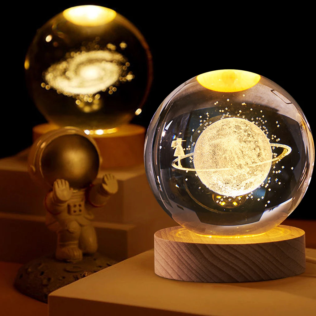 Mini Luminária Led Globo De Vidro Planetário 3d Com Cabo Usb Com Base de Madeira