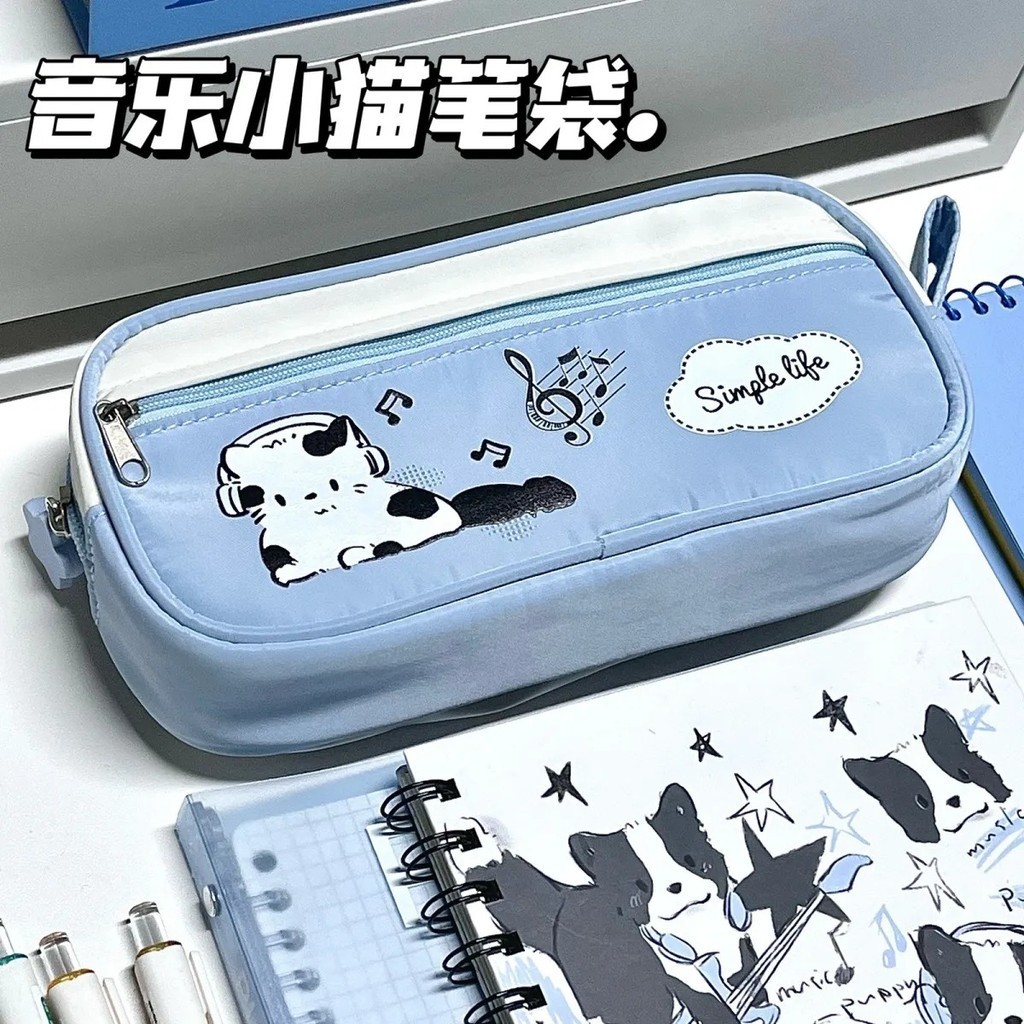 Estojo Para Lápis Azul Com Impressão De Gatinhos De Alta Aparência Saco De Papelaria Zíper Duplo De Estudante