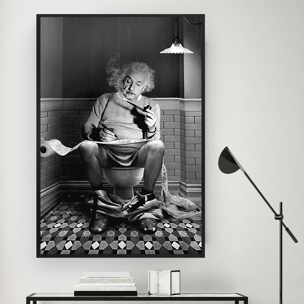 Quadro decorativo 1 peça 40x60 Einstein sentado no vaso sanitário leitura jornal preto branco fotografia moderno decoração para casa sala quarto hall