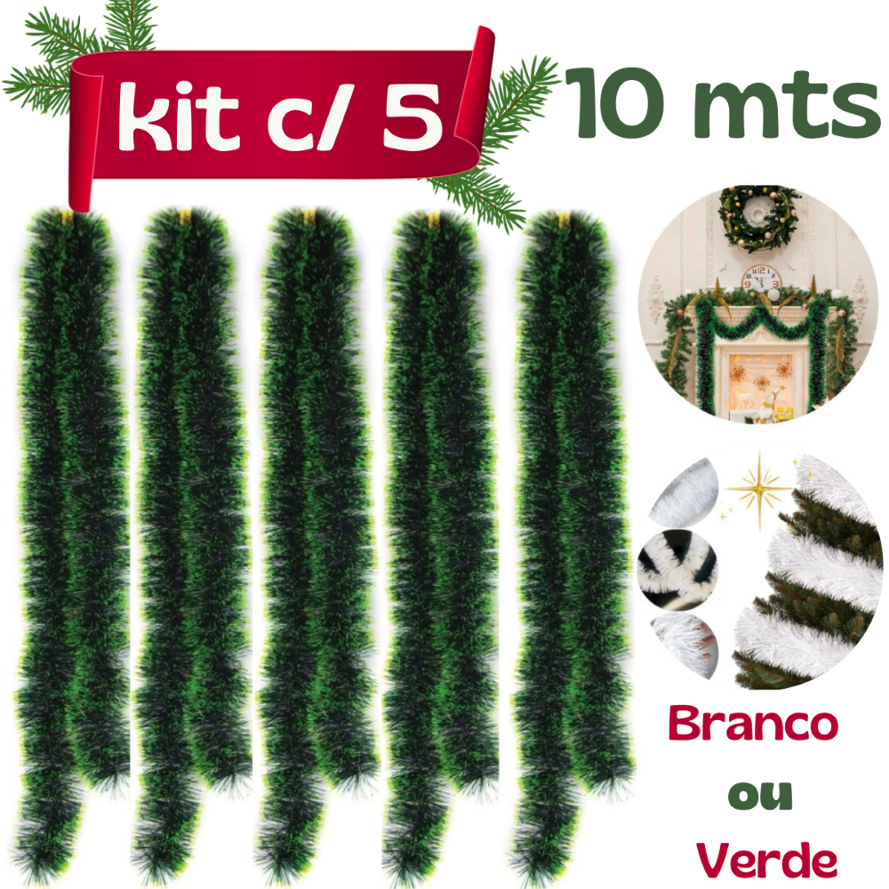 Kit 5 Festão 10 metros Verde ou Branco Enfeite De Natal Realista Cheio