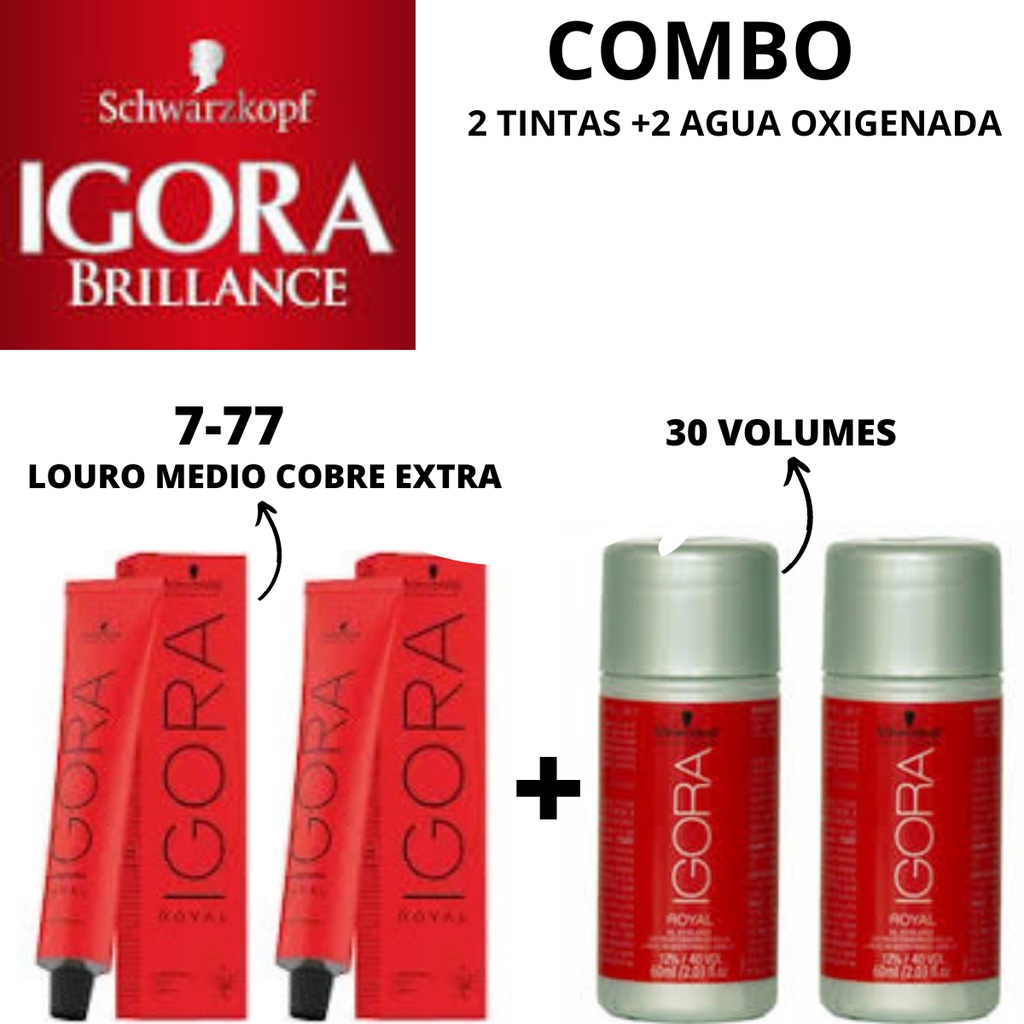 COMBO 2 TINTAS IGORA 7-77(LOURO MEDIO COBRE EXTRA) +2 AGUA OXIGENADA VOL 30