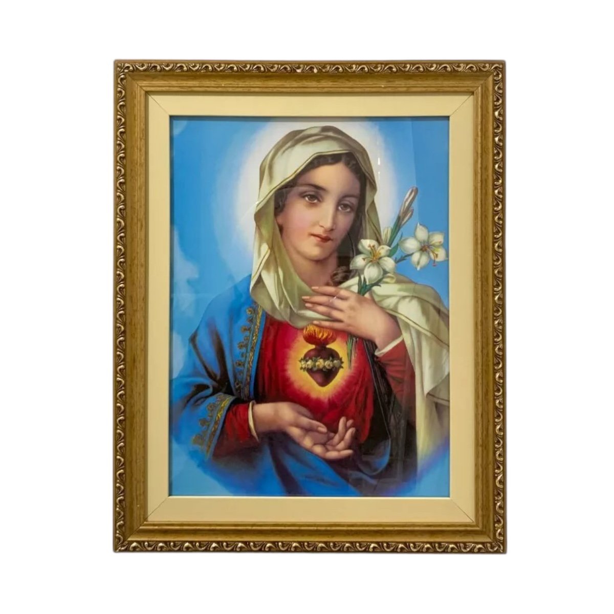 Quadro Sagrado Coração de Maria Azul Vidro Moldura 52x42