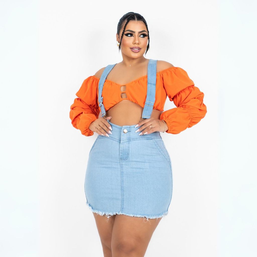 jardineira salopete saia jeans feminina macaquinho plus size c/ lycra