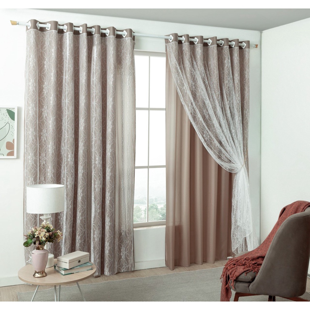 Cortina tecido com renda 3,00 x 2,70 com ilhós - marrom caqui