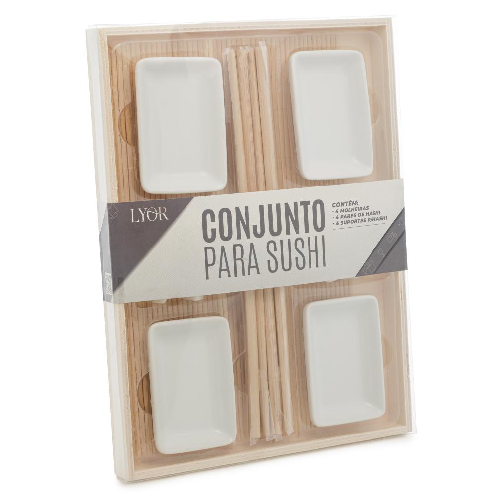 Conjunto Moderno Para Preparo de Comida Japonesa Sushi em Bambu Com Faca, Esteira, Molde Niguiri (Bento), Colher de Arroz, Porta Hashi, Molheira Em Cerâmica E Pares De Hashis