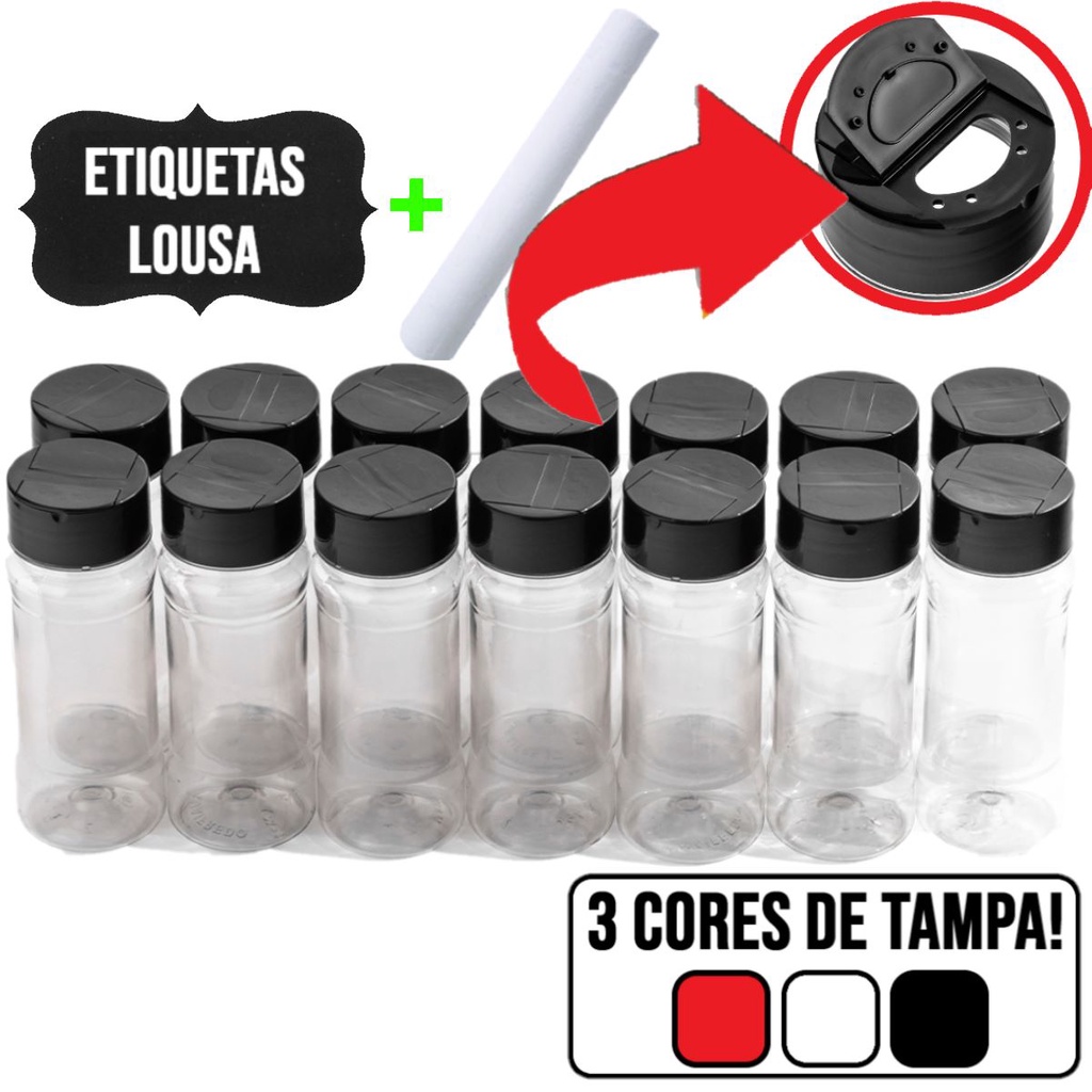 Kit Porta Tempero até 12 unidades p/ Cozinha 120ml c Tampa Dosadora Dupla + Garantia (12 Etiquetas Lousa e 01 Giz para Escrita) Envio Imediato