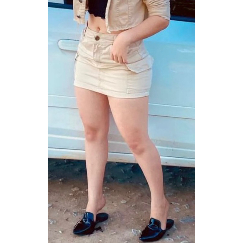 Saia Cargo Jeans Sarja Feminina Cintura Alta Modela Bumbum Linha Premium Bolsos Laterais