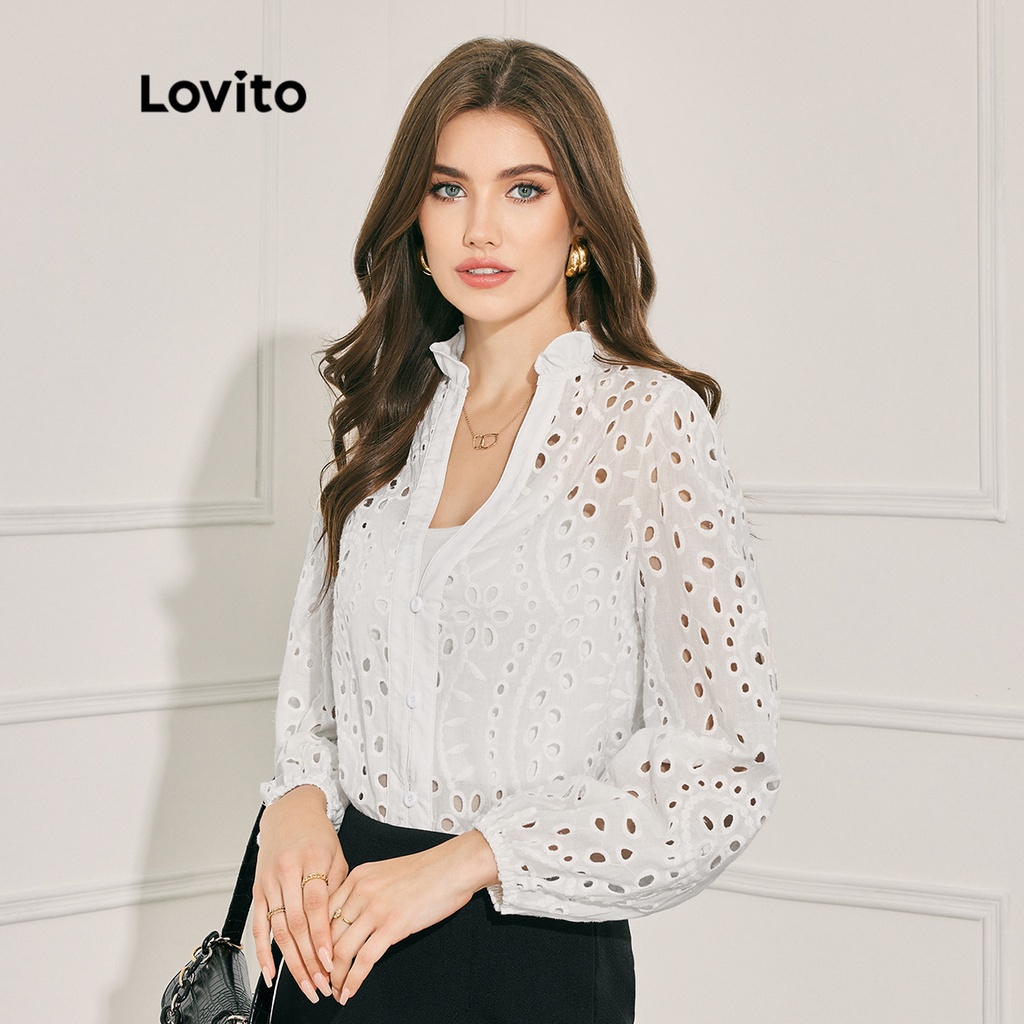 Lovito Elegante Blusa Feminina Com Botões Bordados Florais Frontais E Gola L47LD025 (Branca)