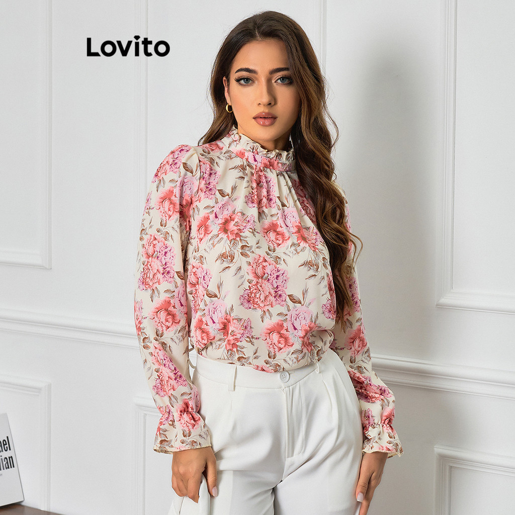 Lovito Blusa elegante com babados florais Ditsy para mulheres LBL11061