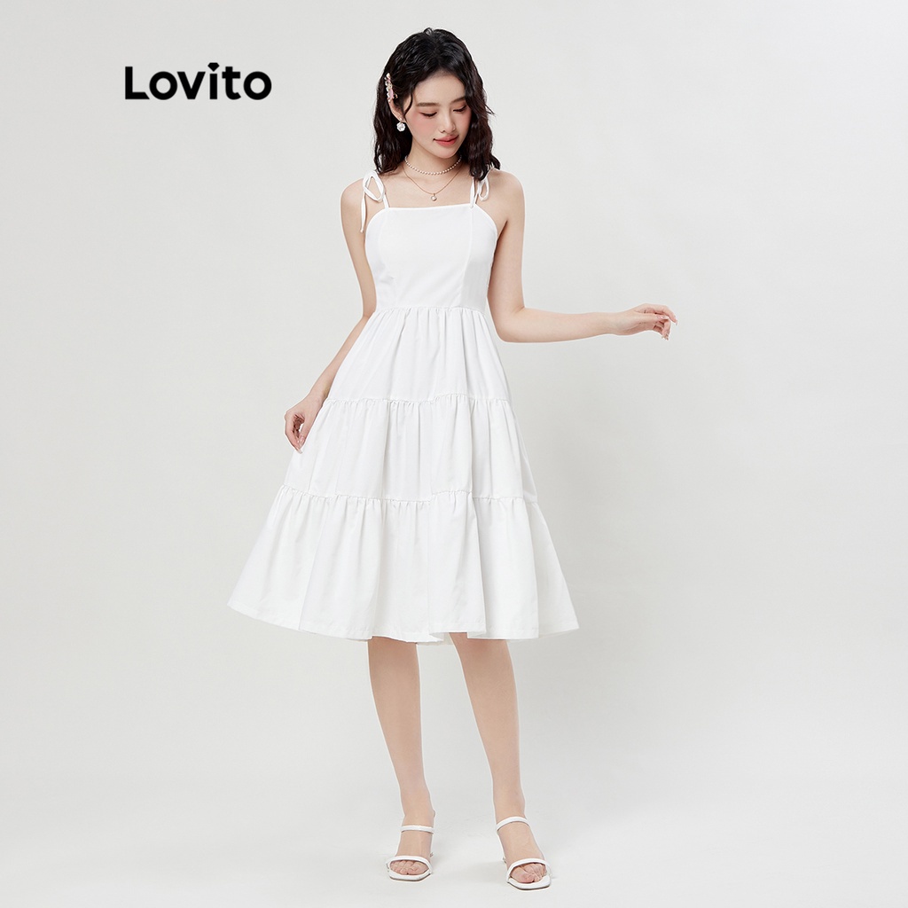 Lovito Vestido Feminino Casual Liso com Alças Finas Em Camadas L33ED024 (Branco)