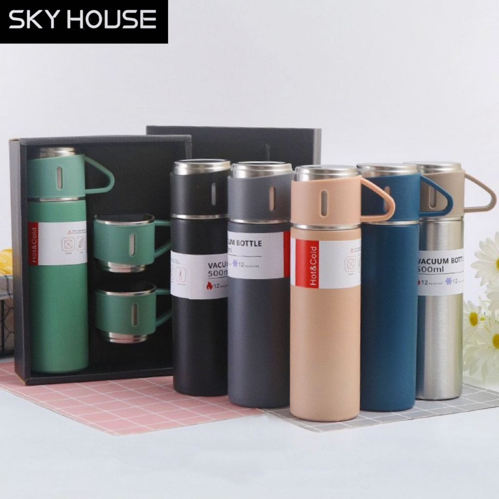 Kit Garrafa Térmica Vacuum Flask Set Inox 500ml + 3 Xícaras Bebidas Fria ou Quente