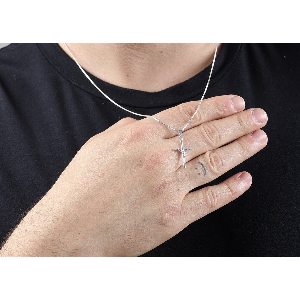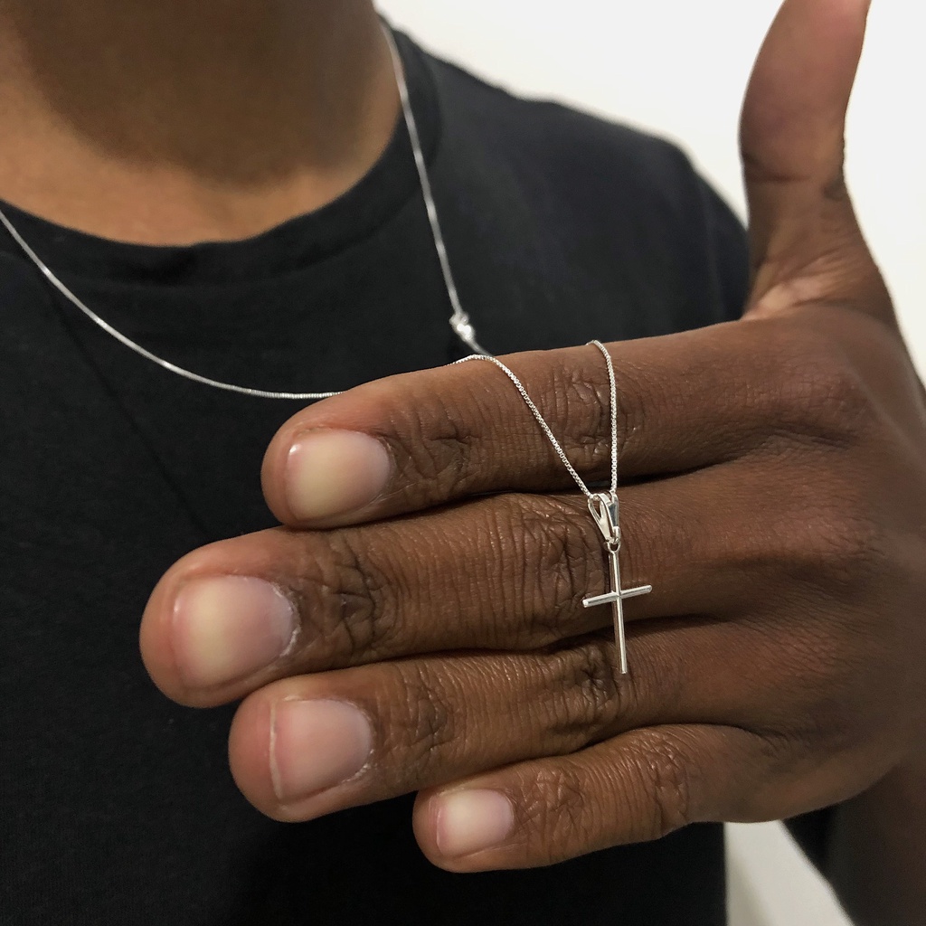 Corrente Veneziana + Pingente Cruz Palito Banhado a Prata 925 Cordão Masculino Correntinha com Crucifixo