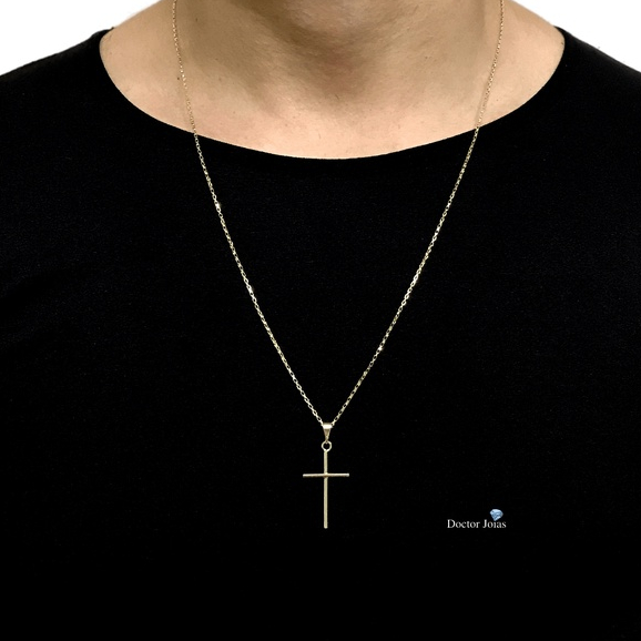 Cordão Masculino Fino + Pingente Cruz Palito Banhado a Ouro Prata Corrente Colar Tijolinho 1mm