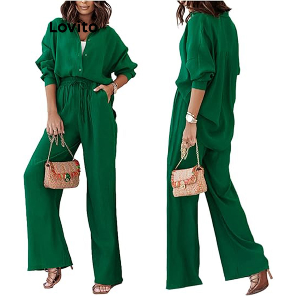 Lovito Conjuntos Casuais De Calças Com Babados Lisos E Bolsos Para Mulheres LNL43080