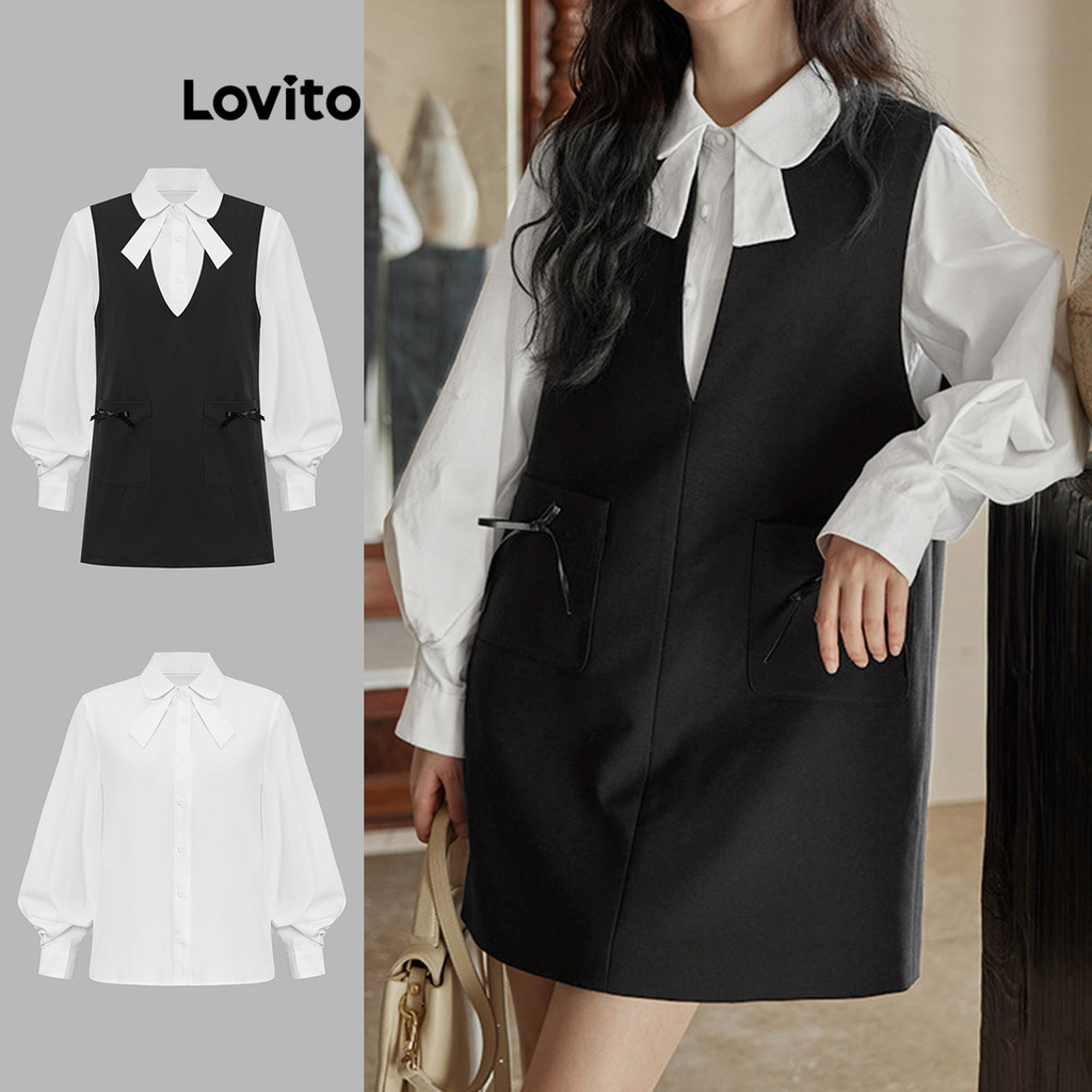 Lovito Conjuntos casuais de saia drapeada com bolso e laço simples para mulheres L106AD270