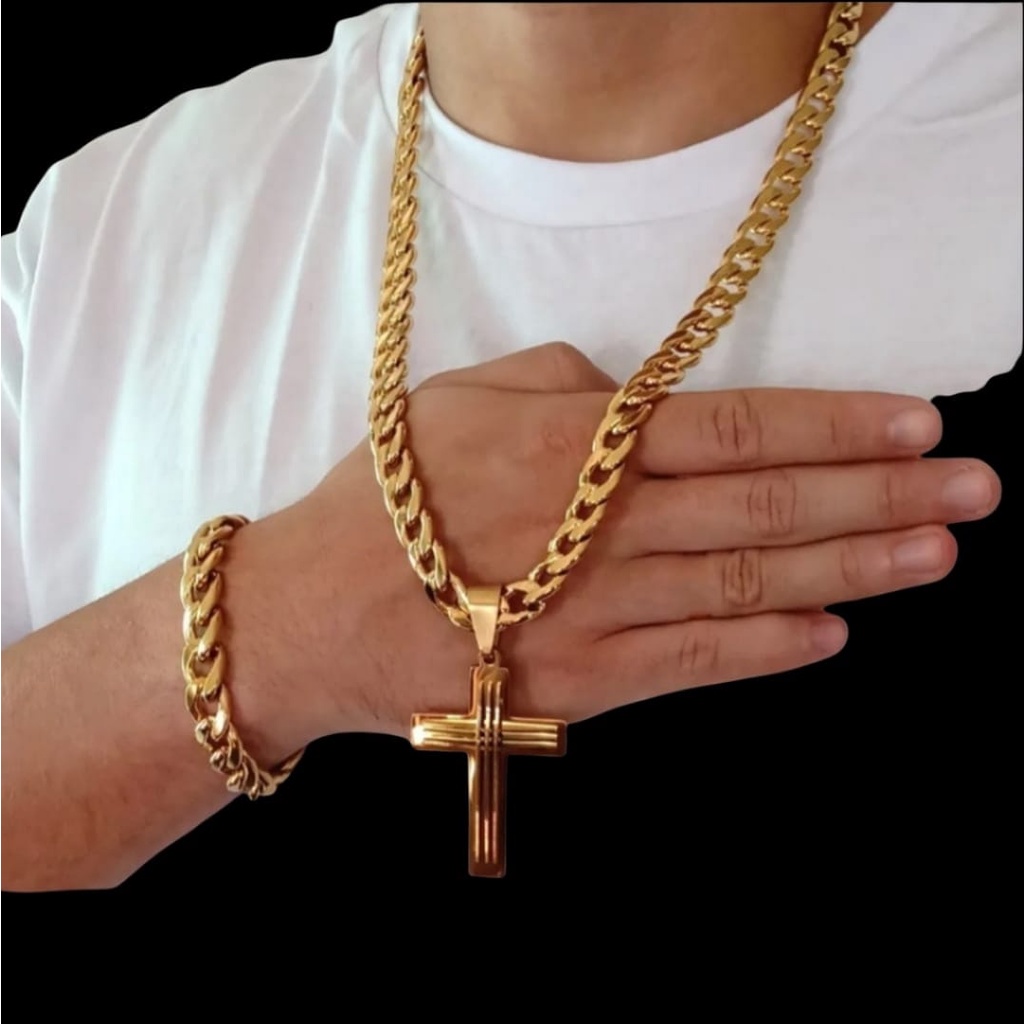 conjunto dourado de corrente e pulseira grossa em aço inoxidável com pingente de cruz de 10mm.