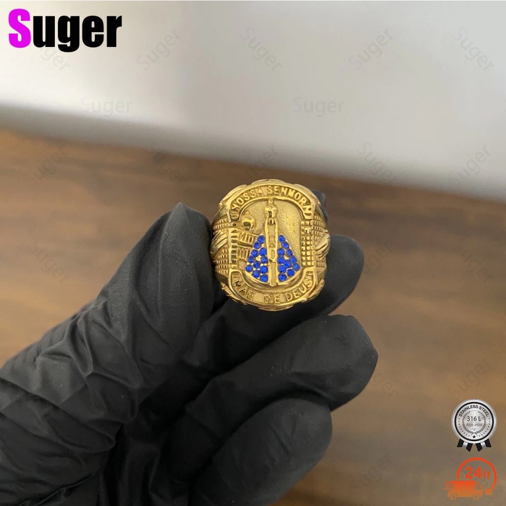 Anel Masculino Dedeira Nossa Senhora Aparecida Crevajada EM AZUL Banhado A OURO Aço Inoxidável Moda Hip-Hop Anel Rock Solid 18k