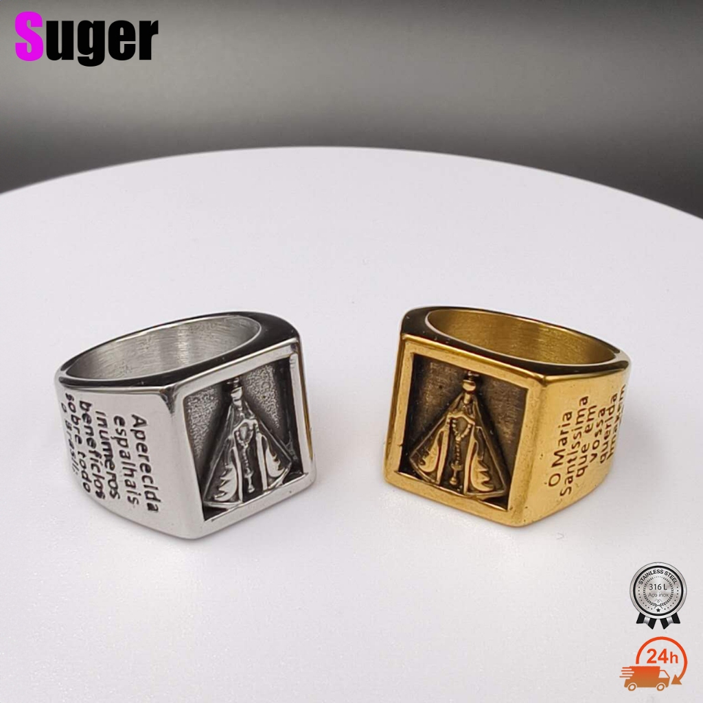 Anel Masculino Dedeira Em Aço Inoxidável Banhado A Ouro Prata Anel Nossa Senhora Aparecida com Oração Quadrado