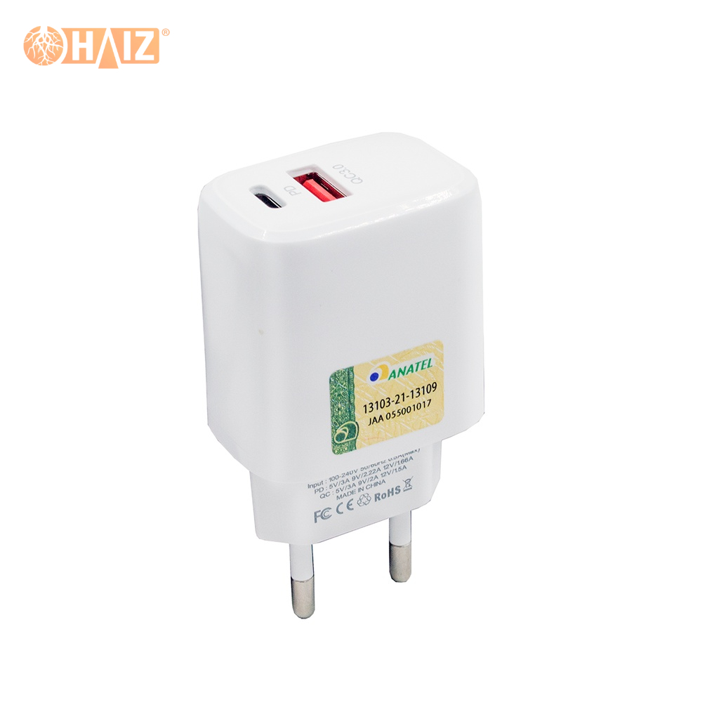 Fonte Carregador Turbo para Celular Bivolt Tomada USB Tipo C QC 3.0 PD 20W 5V Haiz HZ-AC5VH-T
