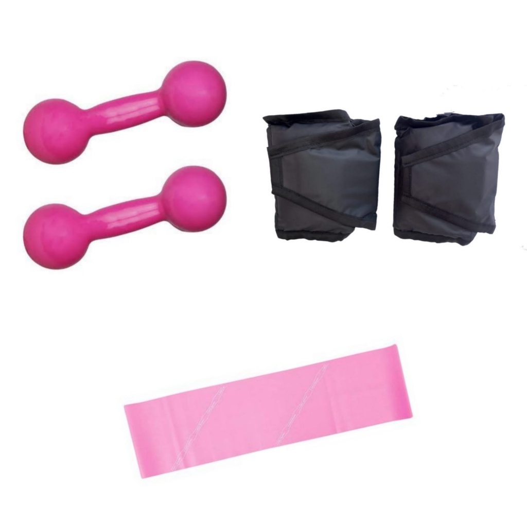 Kit Treino Par Halter Peso Emborrachado 2 Kg Rosa + Par Caneleira 2 Kg Rosa + Kit Theraband 5 Elásticos