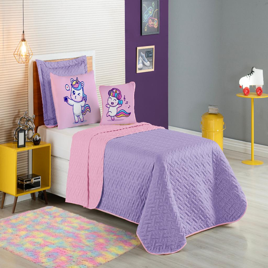 Kit Colcha Cobre Leito 5 Peças Solteiro Infantil Unicornio Selfie Lilas