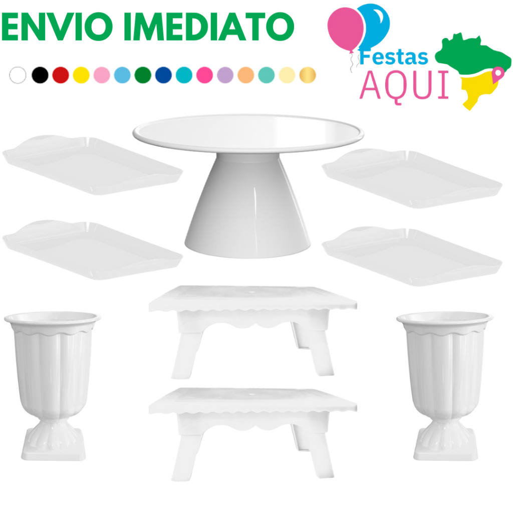 Kit Festa (1 Boleira Cake Renda 19 + 2 Vaso Grego + 2 Bandeja 20x13 + 2 Mesinhas)