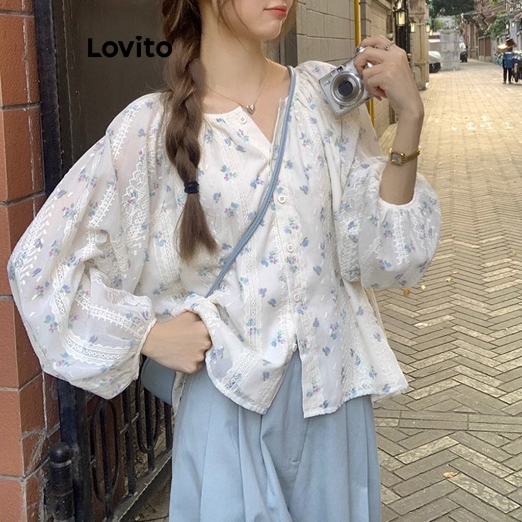 Lovito Blusa feminina casual com botão frontal e ilhó bordado LNL70185