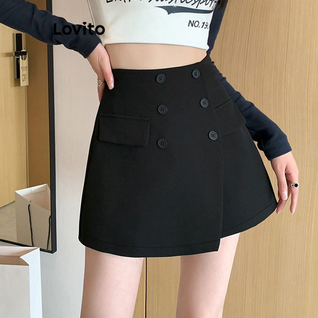 Lovito Saias Casuais Com Zíper Liso Para Mulheres LNE33162 (Cáqui/Cinza/Preto)