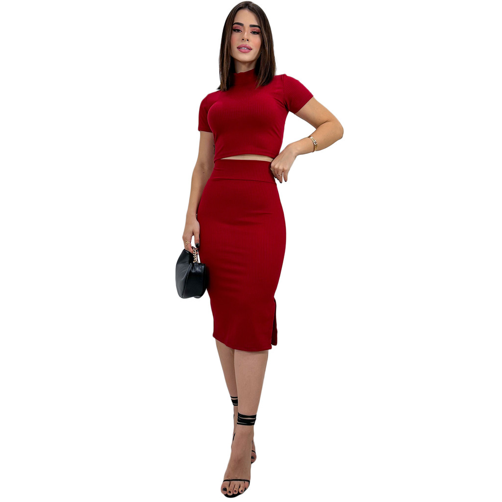 Conjunto Feminino Cropped Social E Saia Midi Canelado Verão