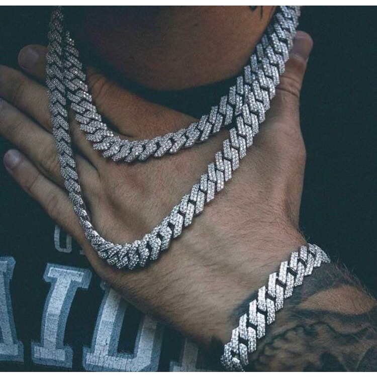 Kit Cravejado Cuban Corrente + Pulseira Ice - Moda Masculina e Feminina / Estilo Neymar / Zircônia / Joias / Trap Hip-Hop / Diamante / Brilhante / Acessórios / Promoção / Colar Cordão Prata