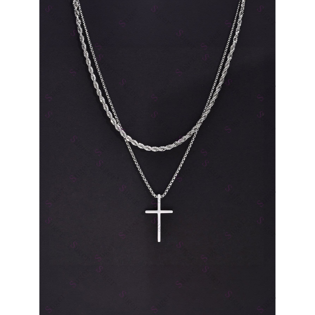 Kit 2 Corrente e Pulseira Torcido Cordão Banhado Prata com colares masculinos com pingente Pingente de Cruz Aço inoxidável 316L