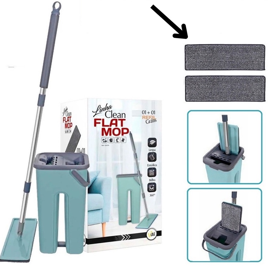 Mop Esfregão Flat para Limpeza Lava E Seca Profissional Multiuso Vertical+ 2 Refil Balde Rodo Magico mob mope
