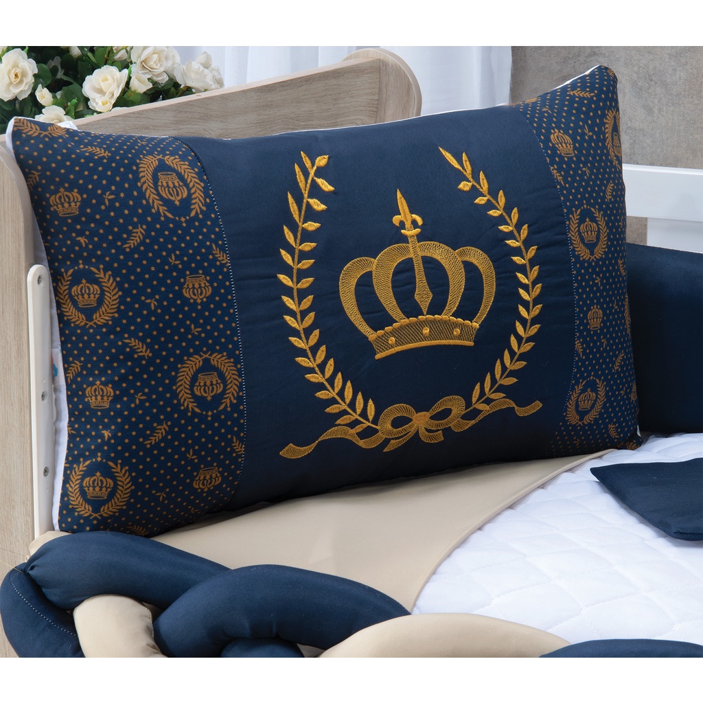 Kit Protetor Berço Coroa Marinho Principe Americano Slim Completo Lençol Almofadas 11 Peças