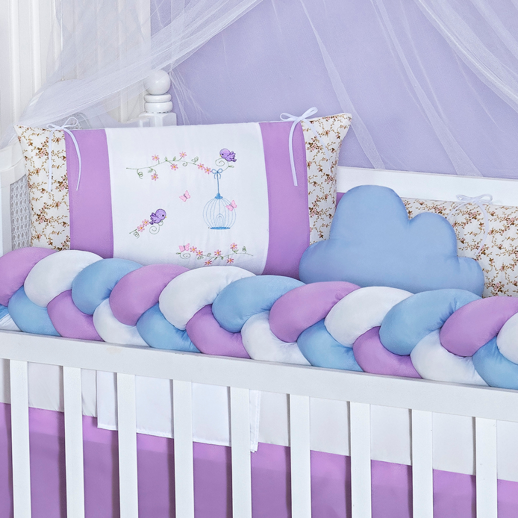 Kit Berço Trança Nuvem Rosa Americano Completo Lençol Berço Protetor Mosquiteiro Almofadas 11 Peças