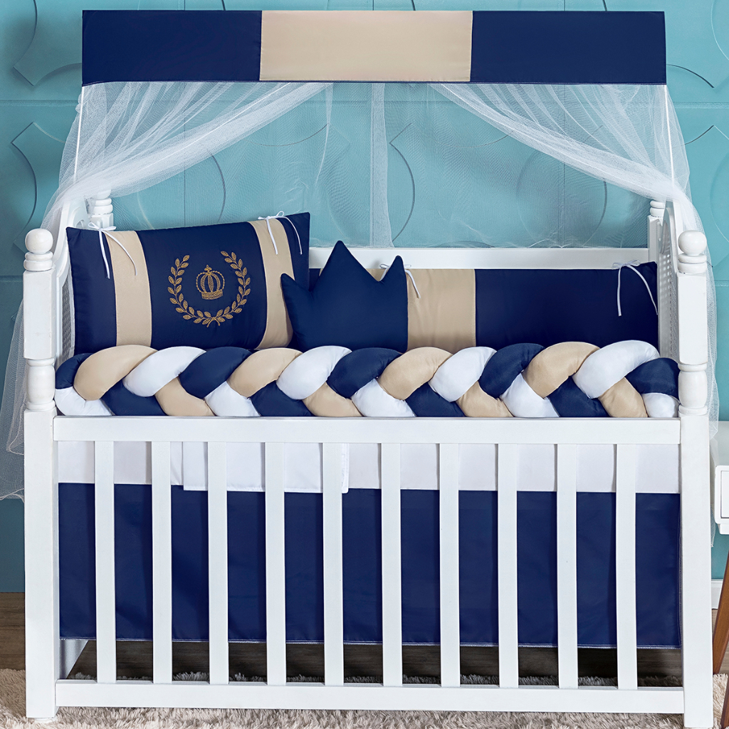 Kit Berço Trança Coroa Luxo Marinho Slim Americano e Nacional Completo Lençol 11 Peças