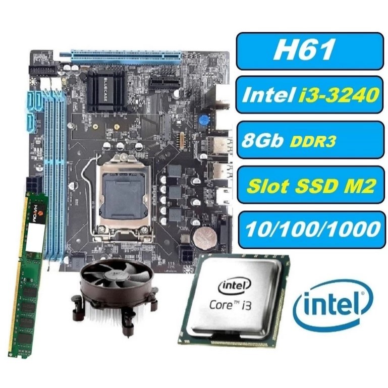 Kit UPGrade Fonte 500W Intel i3-3240 Memória 8GB DDR3 KINGSTON Placa Mãe H61 Slot SSD M2 lga 1155