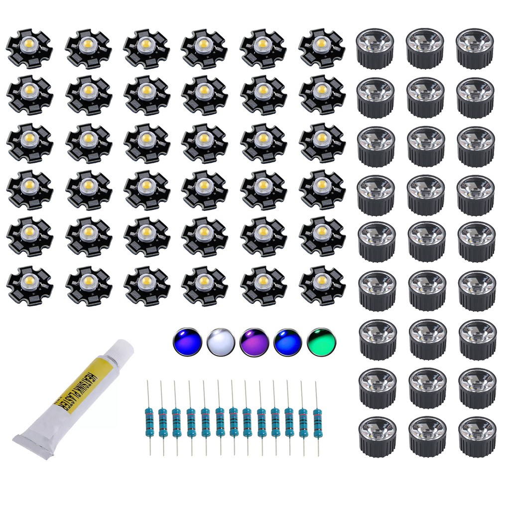 Kit Completo Luminária Chip Led 3w para Aquário Marinho Reef Coral 81w 120 litros Led Azul Royal Branco Frio 10000k Ultra Violeta 395nm Ciano Actínico + suporte técnico monte você mesmo + Lente Colimadora 90º c/ suporte + Cola Térmica + Resistor para 12v
