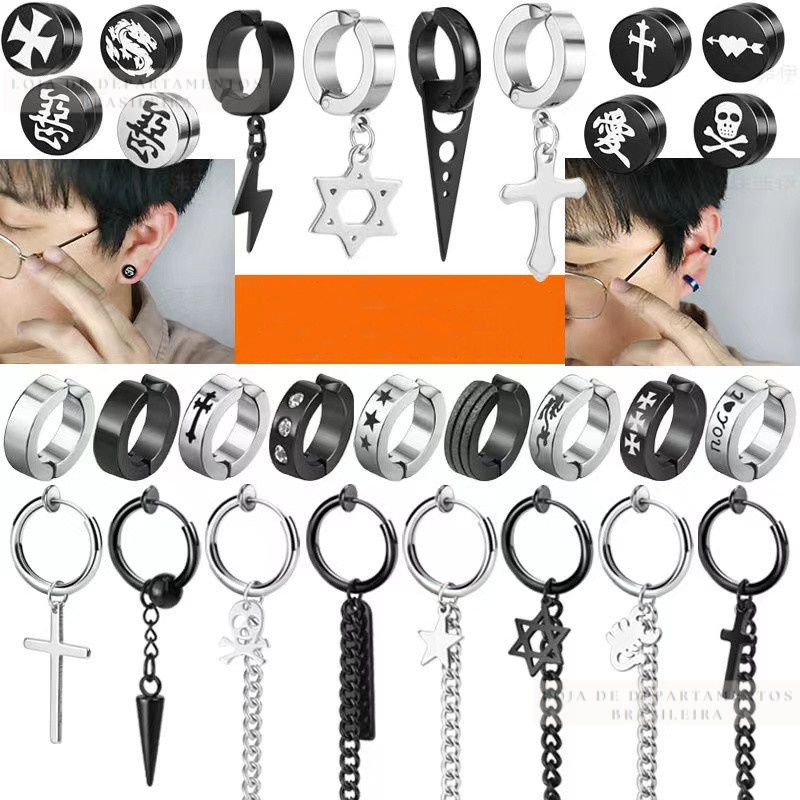 Versão De Metal Em Aço Inoxidável Cadeia Dupla Cruz Brincos / Punk Gótico Estilo Rodada Piercing Do Parafuso Prisioneiro Da Orelha / Mulheres Homens Ear Clipe Jóias Rocha Presentes