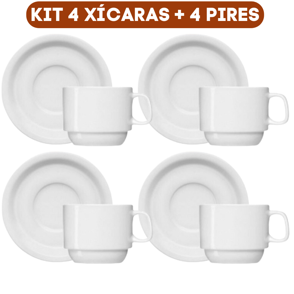 Conjunto 8 PÇS - 4 Xícaras LUXO Café Chá Porcelana Branca 190 ML + 4 Pires Porcelana Branco (ENVIO IMEDIATO)