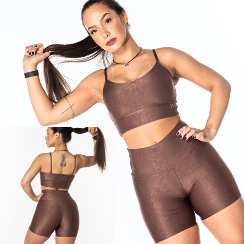 Conjunto Academia Top Strappy + Short CANELADO BRILHO Conjunto Fitness