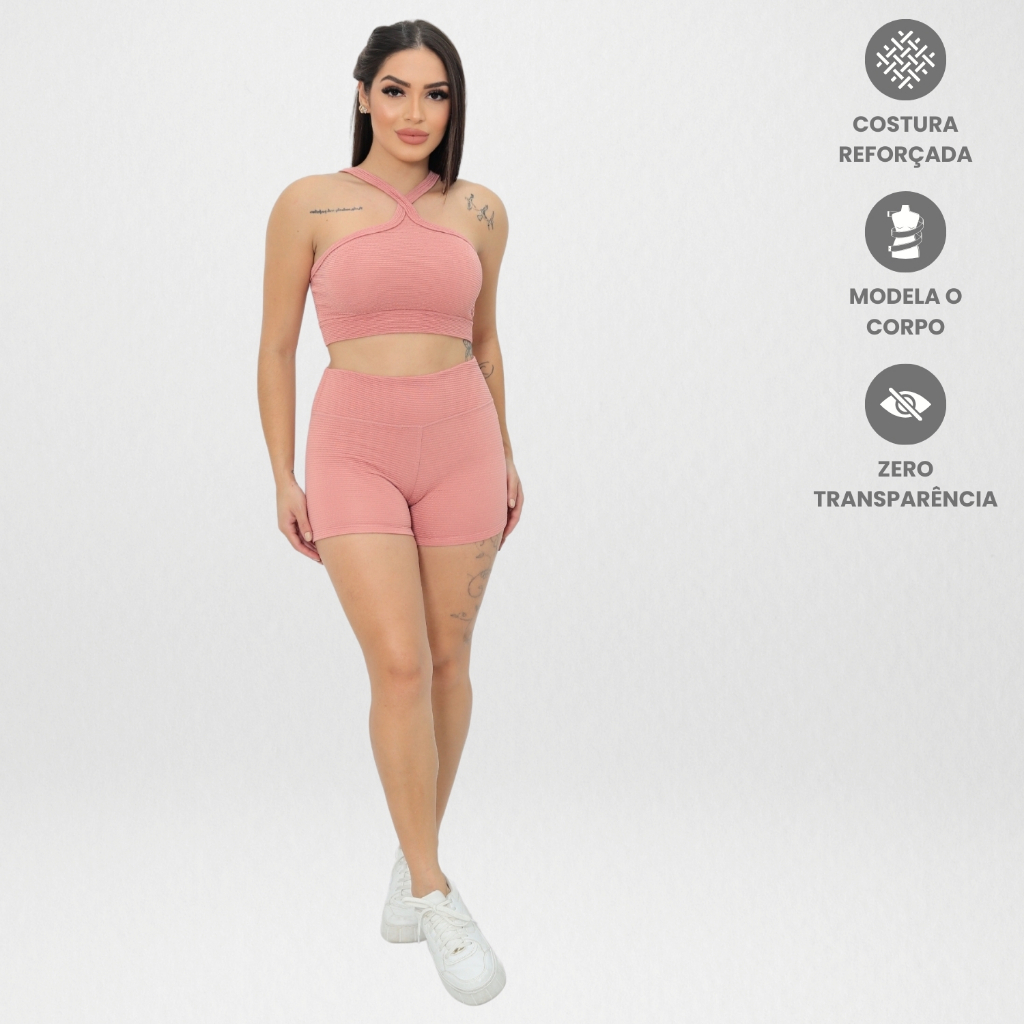 Conjunto Canelado Short e Top Cruzado Roupa Academia Feminina Treino Fitness Corrida Esportiva
