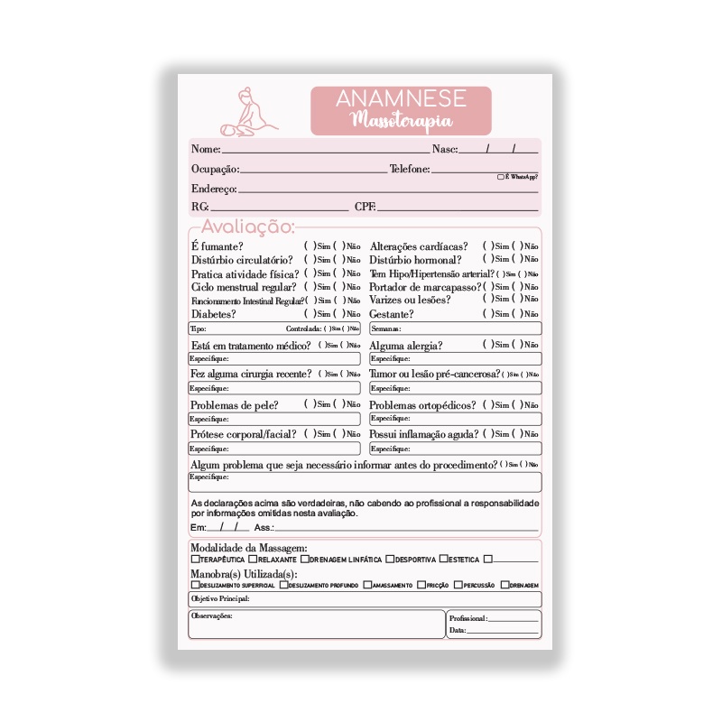 Bloco 100 Folhas Ficha Anamnese Para Massoterapia