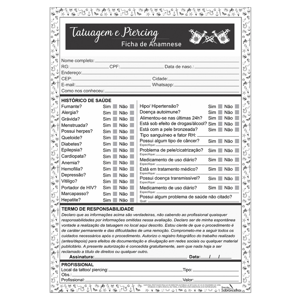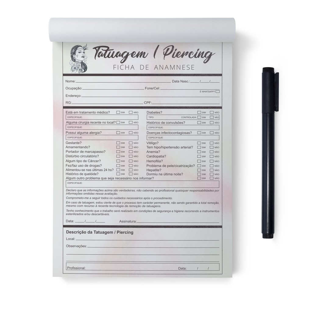 Bloco de Anamnese Ficha Checklist para Studio de Tatuagem e Piercing Tatoo Tatuador