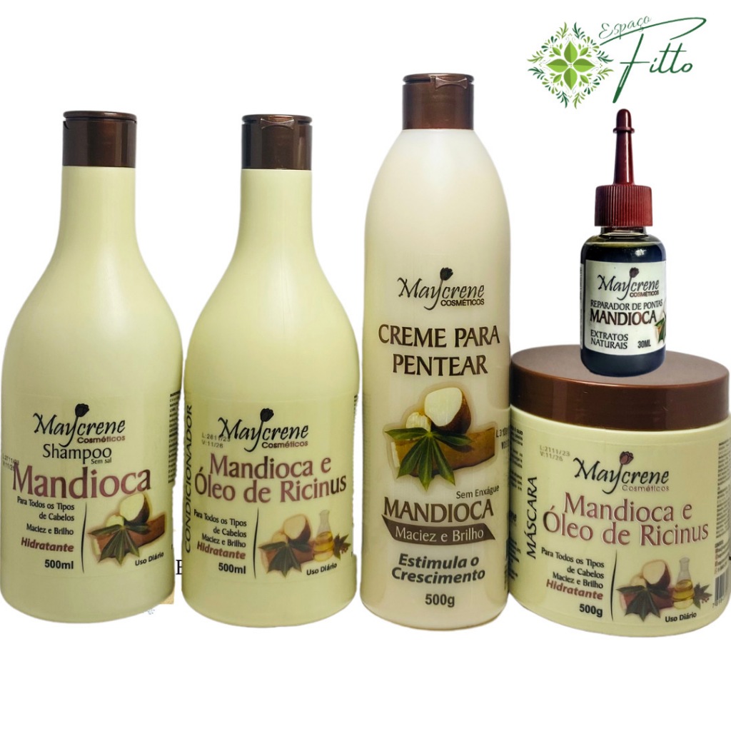Kit Mandioca Fortalecimento e Nutrição Maycrene (shamp+ cond+masc+creme de pentear+reparador de pontas)