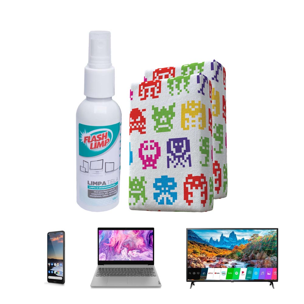 Limpa Telas Notebook Celular Monitor TV Kit Com 2 Esponjas e 1 Limpa Telas 120ML Flash Limp