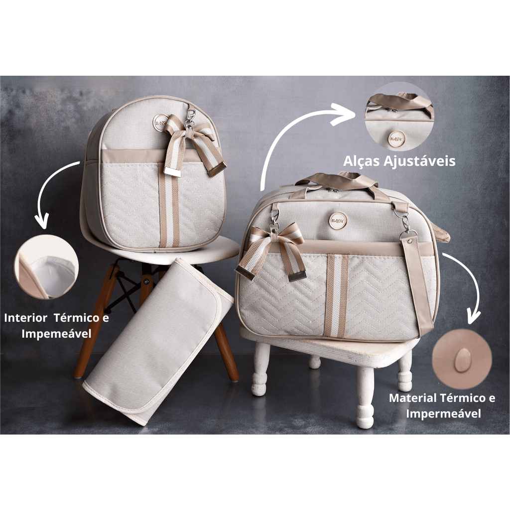 Kit Bolsa Maternidade De Linho com Faixa e Lacinho 3 peças Térmica e Impermeável