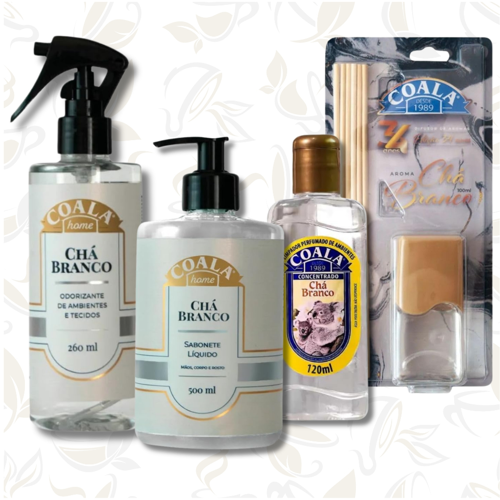 Kit Coala Cha Branco Difusor de Aromas Odorizante Home Limpador Concentrado Sabonete Liquido Ambiente Perfumado